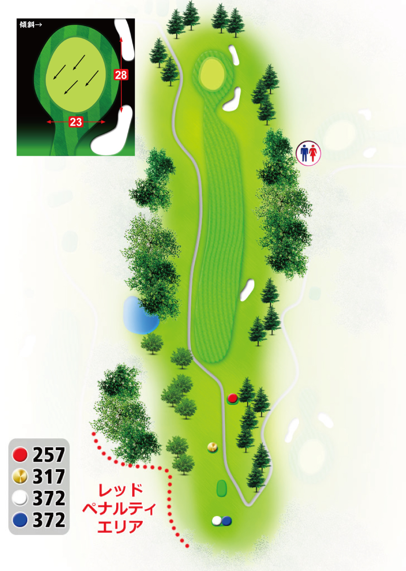 ティーショットを左に曲げて、フチに落ちると池に入りやすいので注意。