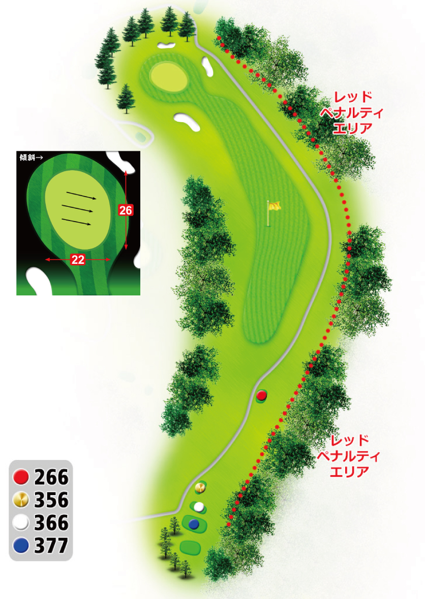フェアウェイの右斜面狙いの場合は、200Y以内で抑えると良い。